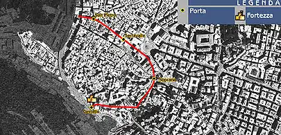 El poblado, encerrado entre la milla (romana) de muro y la línea de la costa, era cercana a las veintidós hectáreas. El trazado, partiendo de la riviera, al Sur del Palacio San Jorge, más o menos donde hoy termina la Estación Metropolitana homónima, trazaba una línea recta que llevaba hasta la puerta en la plaza Cinque Lampadi y la de Serravalle (donde hoy se encuentra en Archivo del Estado).