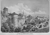 Las murallas que se conservan en la actualidad se completaron alrededor de 1400, constituyendo una estructura de cinco kilómetros en forma de un paralelogramo torcido, que contaba con una torre de entrada en cada uno de sus cuatro rincones. El conjunto defensivo constaba de la muralla exterior (llamada «muralla alta»), la muralla baja levantada desde el foso, el zwinger de 15 metros entre ambas murallas y el foso (más tarde ampliado). Se han podido identificar a partir de antiguas representaciones un total de unas 130 torres de muralla y torres de foso.[6]