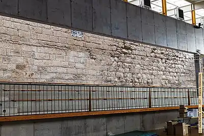 De esta muralla quedan todavía restos en las calles Granados y Yeseros. De hecho, y afortunadamente, en 1641, la antigua muralla que aún forma parte de la calle Granados fue reedificada por amenazar ruinas. Tiene sillares de rústico almohadillado, semejantes a las murallas de Huesca, sugiriendo que son de la época de Amrùs ben Yusuf o de Musa ibn Musa. Al pie del cerro de Santa Bárbara existe también varios tramos de características similares. Uno de ellos, descrito por Pavón-Maldonado, tiene cerca de 6 m de longitud y se sitúa junto al camino de Subida al Castillo. Según Navas-Cámara y Martínez-Aranaz, podría tratarse de las obras de ampliación del recinto amurallado, aunque Basilio Pavón-Maldonado sugirió una fecha más antigua, de finales del siglo VIII o principios del IX, es decir, cuando Amrùs fundó la ciudad. El otro tramo, el de mayor longitud (19 m) y altura (9 m) y el mejor conservado, se descubrió en 1986 gracias a Juan José Bienes-Calvo, en el fondo del patio de una casa de la calle Padre Ubillos.