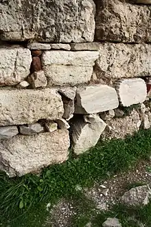 El Muro de Temístocles se terminó de construir en el 479 a. C.[3] Para su construcción reutilizaron materiales antiguos. en este caso destruyeron templos, estatuas y otras ruinas[3] debido a la naturaleza apresurada de la obra y al material fácilmente disponible.