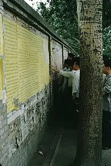 Durante el período comprendido entre noviembre de 1978 y diciembre de 1979, miles de personas colocaron carteles de grandes caracteres en un largo muro de ladrillos de la calle Xidan, en el distrito de Xicheng de Pekín, para protestar por los problemas políticos y sociales de China. Con la aquiescencia del Gobierno chino, pronto se extendieron también en las principales ciudades de China otros tipos de actividades de protesta, como diarios extraoficiales, peticiones y manifestaciones. Este movimiento puede verse como el comienzo del movimiento democrático de China. También se conoce como el Movimiento del Muro de la Democracia. Este corto período de liberación política fue conocido como la Primavera de Pekín.