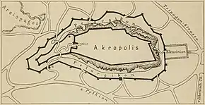 Se dice que fue construida por los pelasgos, durante el siglo XIII a.C. todavía quedan algunos restos de esta muralla en la Atenas moderna. Se cree que el muro tenía un grosor de 6 metros, según los restos arqueológicos del sitio.[2]