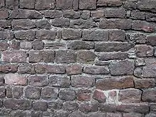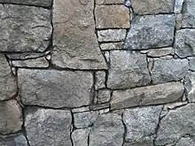Los muros de piedra suelen estar hechos de materiales locales que van desde la piedra calcárea y sílex hasta el granito y el gres . Sin embargo, la calidad de la piedra de construcción varía mucho, tanto en su resistencia a la intemperie y a la meteorización, en la resistencia a la penetración del agua y en su capacidad de trabajar con formas regulares antes de la construcción. La piedra trabajada es conocida generalmente como sillares y se utiliza a menudo para las esquinas de los edificios de piedra. El granito es muy resistente a la intemperie, mientras que algunas calizas son muy débiles. Otras calizas, como la Piedra de Portland, son más resistentes a la intemperie.[2]