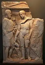 - Relieve votivo de mediados del siglo IV a. C. Representa a Artemisa ante una familia que acude con un animal para el sacrificio.