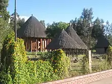y las técnicas campesinas de construcción, se levantaron varias , que en 1964 describió Silva Célis así: bohíos de planta circular,con paredes de bahareque, es decir, de caña y barro, con techos cupuliformes de paja.[1]