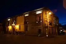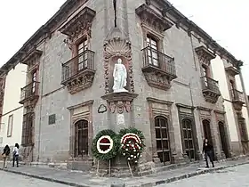 La fachada es asimétrica; su entrada principal tiene una portada barroca con elementos neoclásicos, con balcones y rejas de herrería en fierro forjado, consta de dos niveles.[2]