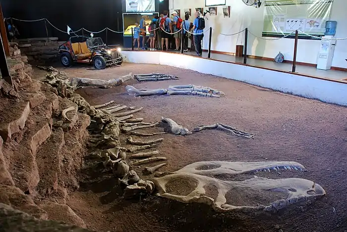 La exhibición paleontológica cuenta con reconstrucciones y fósiles originales de diversas especies extintas. Se destaca la especie de dinosaurio más conocida del país, el Giganotosaurus carolinii del que se encuentran expuestos una reconstrucción montada del esqueleto articulado y los restos originales así como reconstrucciones montadas de Neuquensaurus australis y Amargasaurus cazaui junto con la recreación en vida de la cabeza y cuello de Bajadasaurus pronuspinax. Por su parte, se expone una réplica de vértebra de Argentinosaurus huinculensis y el fémur original de un titanosaurio indeterminado. También se puede ver en las exhibiciones una réplica del esqueleto montado de Carnotaurus sastrei y de Skorpiovenator bustingorryi, este último tal como fue hallado en el sitio de excavación. Junto con el Carnotaurus se encuentran expuestos las vértebras caudales, dorsales, los metacarpos y maxilar originales de Choconsaurus baileywillisi un saurópodo que debe el nombre de su género a la localidad. Además de dinosaurios se encuentran exhibidos los materiales originales de Prochelidella sp., Kaikaifilusaurus calvoi, Avitabatrachus uliana, y la réplica de Araripesuchus patagonicus. [9]