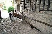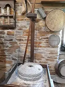 - El corredor, que exhibe una colección de carretillas y carretas en la parte baja y molas o ruedas de afilar en la parte alta.