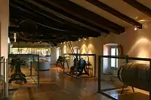 - Torno mecánico- Torno mecánico que imprimía un movimiento de rotación sobre una pieza de madera, la cual se redondeaba apoyándole una herramienta cortante. Este torno procede de la tornería Can Casadesús de Arbucias, fundada en 1898 y que producía canillas y lanzaderas para la industria textil. El torno se montó con las transmisiones (correas y poleas) originales, de manera que se puede accionar y poner en funcionamiento.[18]