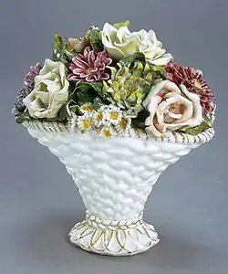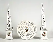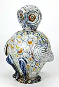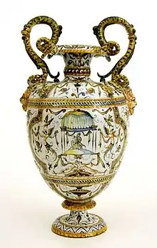 El motivo del grotesco pasó a aplicarse en nuevas formas: el salero estará sujeto por arpías y delfines, el enfriador se presenta sostenido por pies de formas zoomorfas. A estos objetos se unieron los pequeños obeliscos, los tinteros y las fuentes que se ejecutaron sobre todo perforadas, otras piezas pertenecientes a vajillas tienen decoraciones añadidas de fruta, flores, mascarones o putti. Todo esto consiguió hacer el paso del arte de la cerámica desde el renacimiento a la interpretación de los cánones del manierismo y hasta la transición del barroco.[26]