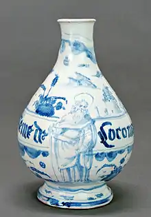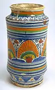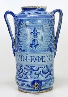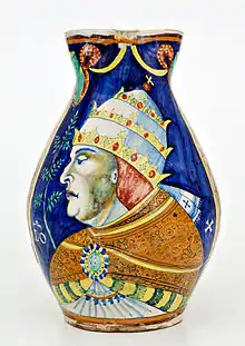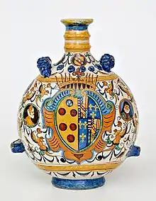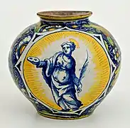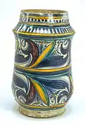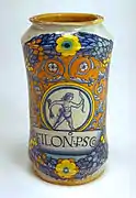 Durante mediados del siglo XVI, se realizaron los albarelos, destinados a boticas, con colores brillantes sobre un fondo amarillo, verde, naranja, rojo, que recogían las formas decorativas de los grutescos, como un delfín, guirnaldas, las estilizadas hojas de acanto y guerreros o personajes de leyenda, tomados de la literatura del renacimiento. A menudo los figuras personificaron a los héroes de los poemas de Matteo Boiardo y Ludovico Ariosto, centrados por encima de las cartelas medicinales, como en el tarro globular en la que está pintado el busto de Agramante por encima del cartel farmacéutico. Las formas más comunes fueron las del repertorio destinado a la farmacia: cajas de píldoras, albarelos, tarros y frascos grandes globulares.[22]