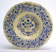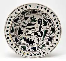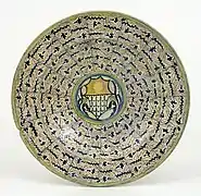 - Plato con decoración de «ojo de pluma de pavo real», en el centro emblema religioso manfrediano. Faenza, final siglo XV.