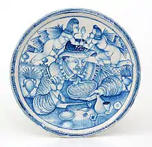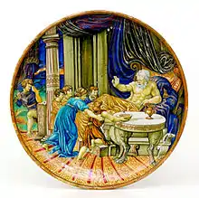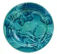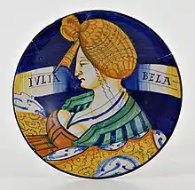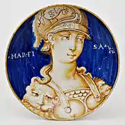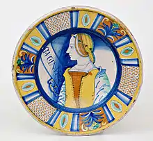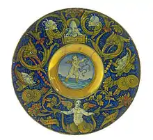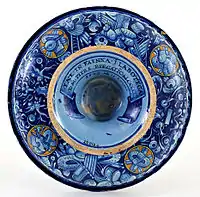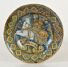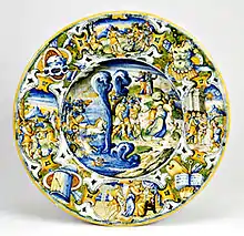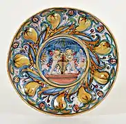 Otro tipología de derivación rafaelesca está bien representada en otra obra: un plato pintado con un gran borde y esmaltado con reflejo de oro, sobre el fondo azul se encuentra un cupido dentro de un círculo dorado, en el gran borde del plato se encuentran delicados grotescos que incluyen cabezas de aves fantásticas, una sirena con dos colas, mascarones, copas, y en la parte central dentro una cartela el escrito SPQR en recuerdo del fausto de la antigua Roma. Fue realizado por Giorgo Andreoli hacia 1525.[37]