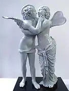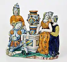 Otra interesante producción se distingue en el último cuarto del siglo XV. Son las pequeñas obras escultóricas en mayólica policromada, realizadas en relieve o corpóreas, de tema sagrado y profano, que se caracterizan como algo mágico. Los temas están inspirados en las obras monumentales del repertorio de los maestros escultores del valle del Po. Entre las representaciones de tema profano la más generalizada será con la forma de tintero como por ejemplo el Juicio de Paris, con los personajes clásicos dispuestos alrededor de una fuente: Mercurio, Paris, Venus, Juno y Minerva.[15]