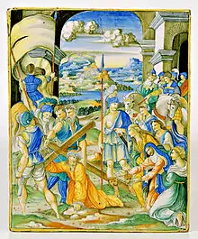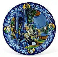 Aparecen los grandes platos famosos de pompa y la vajilla de mesa, «credenze», pintado monocromo en azul o en los brillantes colores amarillo/azul al que se añade el brillo metálico, con reflejos rubí rojo, amarillo dorado y más raramente de plata. También se aplicaba a la cerámica pintada con temas históricos, y «hasta en lo grotesco, los trofeos musicales y de armas antiguas, motivos a candelieri etc.»[35]