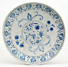 Continúa en todo el primer trimestre del siglo XVI la producción de loza decorada «a la porcelana»,[nota 3] en las jarras, cántaros, platos, bandejas y alberos con asas que trenzadas que imitan cordones, los colores están difuminados en monocromía azul, con toques de naranja, rojo, verde y amarillo en cartelas y en las representaciones heráldicas.