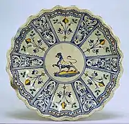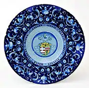 - Plato con grutescos, centrado con el emblema del obispo de Faenza. Segundo cuarto del siglo XVI.