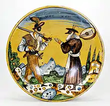 Se vuelca sobre la loza representaciones delicadas de la figura humana, en tipologías de carácter individual, como damas, músicos y figuras alegóricas a un tema específico, como fue el hecho común en varias fábricas de la zona centroitálica de las llamadas «bellas mujeres», pintadas de colores brillantes, con generoso escote, lujosas vestiduras, sombreros, y realizadas acompañadas de una cartela con el nombre de la persona representada unido al adjetivo «bella». La ilustración de este tema muchas veces se extiende sobre toda la superficie del plato, sin guardar ninguna línea de separación entre la parte honda y el ala del plato.[17]