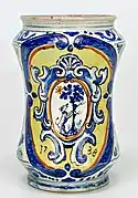 - Tarro globular, en su centro un medallón con el busto de Agramante, sobre el registro farmacéutico. Circa 1550.