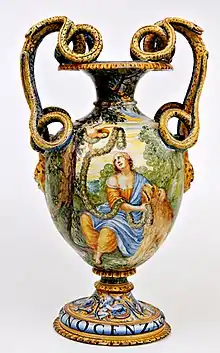 Los maestros alfareros,[nota 4] sensibles a este momento, desafiaron con éxito una línea figurativa siempre aceptable a la presión requerida por un cliente culto y con ganas de mostrarse erudita con la presencia de textos literarios en boga: Sueño de Polífilo de Francesco Colonna, Las Metamorfosis de Ovidio, Ab Urbe condita libri de Tito Livio o las imágenes de la Biblia.[35]