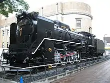 Muestra de una locomotora a vapor frente al Museo Nacional de Ciencia de Japón.