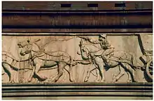 En su diseño estaba incluido un friso esculpido por Caspar Buberl. Debido a que una escultura de ese tamaño estaba fuera del presupuesto de Meigs, hizo que Buberl creara veintiocho escenas diferentes, con una longitud total de veintiún metros, que posteriormente fueron mezcladas y modificadas ligeramente para crear el continuo desfile de 365 metros de longitud y más de mil trescientas figuras. Debido a que las veintiocho secciones están modificadas y mezcladas, solo se aprecia con un examen cuidadoso que el friso se compone de las mismas figuras repetidas varias veces. La escultura incluye infantería, armada, artillería, caballería y contingentes médicos, así como una buena parte de las funciones de suministro y de intendencia, porque fue en esa categoría en la que Meigs había servido durante la Guerra de Secesión. La correspondencia de Meigs con Buberl revela que Meigs insistió en que se incluyera un teamster, que «debía ser negro, un esclavo de plantación liberado por la guerra», en el panel del intendente. Esta figura finalmente asumió una posición central, sobre la entrada oeste del edificio.