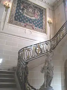 El hueco de la escalera está decorado con un gran tapiz llamado «cancillería», tejido en lana y seda en la Manufactura Real de Gobelins para Michel Le Tellier, canciller de Francia desde 1677 hasta 1685, que pertenece a una serie que pasó a continuación al marqués de Argenson (1652-1721), titular del cargo desde 1718 hasta 1720, que hizo colocar en él sus armas. La edición de 1954 del catálogo del museo cita otros cinco ejemplares conservados por sus descendientes: uno está en el Museo de las Artes Decorativas de París; y otro formaba parte de las colecciones Rochebrune/du Fontenioux, albergadas primero en el Castillo de Terre-Neuve en Fontenay-le-Comte, donde fue fotografiado hacia 1890, y posteriormente en el Castillo de la Court d'Aron en Saint-Cyr-en-Talmondais, donde fue fotografiado en el curso del siglo xx. Es en esta sala de entrada, de decoración tradicionalmente sobria, donde los lacayos esperaban a sus señores en las recepciones.