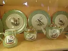 La presencia del coleccionista se siente particularmente en el pequeño «gabinete de porcelana» adyacente al comedor, rodeado por alacenas de vidrio, donde comía cuando estaba solo. Aquí se encuentra una colección única de diferentes vajillas de porcelana de Sèvres (1784-1809), como la de los «pájaros de Buffon», ilustrada por François-Nicolas Martinet. El conde de Camondo compró la vajilla de porcelana blanda con punteado verde (llamada vajilla Le Fevre) al anticuario Jacques Seligmann.[upper-alpha 1] En el comedor, el visitante puede observar piezas de platería encargadas por Catalina la Grande para su valido Grigori Orlov, restos de un gigantesco conjunto de más de ochocientas piezas.[8]