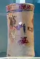 El jarrón se usaba para beber chocolate y describe una escena mitológica que al parecer presenta al la diosa luna,[15] pero con más probabilidad al dios tonsurado del maíz, quién, en su función de deidad lunar, lleva un conejo en sus brazos.[16] El dios está sentado en un trono, el cual está decorado con una banda celestial. Debajo de ella se encuentran tres tarros de pulque.