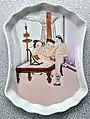 - Un plato de porcelana china cubierto, c. 1900, que muestra dos escenas de parejas que tienen relaciones sexuales, una a caballo