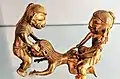 - Estatuilla francesa de metal pintado, c 1900, que muestra a un caballero seduciendo a su amante en un tambor de campaña.