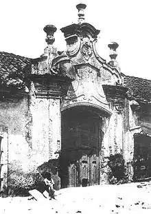 En la reestructuración de la casa, realizada en 1916, se dotó a la construcción de un ancho portal de madera a tableros, coronado con molduras y ornamentos peruanos, y una puerta verde adintelada, a dos hojas, con arco escarzano, que se abre aparte de la carpintería general. El pórtico barroco imita al de la ya desaparecida Casa Basavilbaso, conocida como Aduana Vieja.