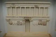 La fachada del santuario númida está reconstruida en el patio en su tamaño original, con fragmentos de su decoración arquitectónica que datan del siglo I a. C. Datado alrededor del 139 a. C. y dedicado por Micipsa a la memoria de su padre Massinissa,[10] el monumento, construido en mármol, tiene unos doce metros de largo, cinco metros y medio de ancho y diez metros de alto. Consta de dos niveles: el primer nivel, coronado con un friso, tiene una puerta falsa enmarcada por pilastras, mientras que el segundo nivel está decorado con una columnata dórica.[10]