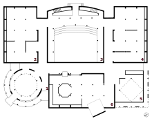 Leyenda: 1. Rotonda de entrada; 2. Sala de exposición «Geología y Protohistoria»; 3. Patio y techo panorámico; 4. Sala de exposición «Mármol»; 5. Sala de exposición «Colonia Romana»; 6.: Área de información y sala de lectura.