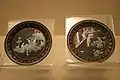 - Dos platos negros lacados de la Dinastía Ming con incrustaciones madreperla de escenas domésticas.