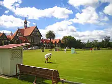 ![]() Vista frontal del Museo de Rotorua, anteriormente la Casa de Baño, ubicada en los Government Gardens. | ||