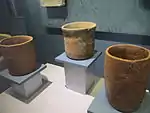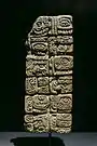 Aguijón de cola de raya, grabado, que formaba parte del ajuar funerario de Aj Pakal Tahn. | Cabeza maya con deformación craneana. | Caracol usado para crear sonidos musicales o de guerra | Cabezas en estuco decoraban los templos. | Vasijas de barro. | |||