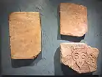 Diversos ladrillos grabados. | Ladrillo del dios Ahkal Te' Chaahk Ohl K'uh | Una de las 7 urnas funerarias encontradas | Uno de los 4 601 ladrillos grabados | Recipientes de barro. |