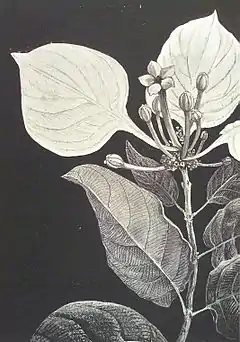 Es un arbusto trepador que alcanza un tamaño de 9 metros de altura, tiene flores amarillas, muy perfumadas, con el cáliz de lóbulos blancos. Se encuentra en los bosques de Camerún.[1]