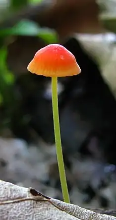 Se encuentra en Asia, el Caribe, América del Norte y Europa. Estos hongos crecen en las ramas muertas y otros residuos leñosos de las plantas forestales, especialmente a lo largo de arroyos y otros lugares húmedos. La forma del sombrero (píleo) es de color naranja y su diámetros alcanza a 1 centímetro de diámetro y tiene forma acampanada, sus tallos son delgados y llegan a medir 6 centímetros de largo, las branquias son de color amarillo pálido con el borde blanquecino. Son comestibles.