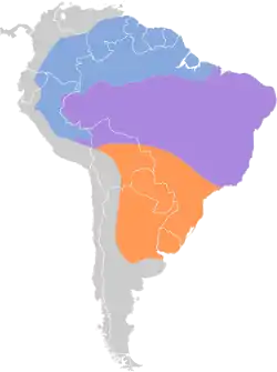 Se distribuye en el este y sureste de Perú y centro y este de Brasil al sur hasta el este de Bolivia, Paraguay, Argentina (al sur hasta La Rioja, San Luis, La Pampa y norte de Buenos Aires) y Uruguay; las poblaciones sureñas migran hacia el norte.[3] Es vagante ocasional en Chile[1]