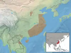 La información sobre la población de la especie es bastante baja, pero ha sido registrada en la República Popular China (en las provincias de Anhui, Beijing, Fujian, Guangdong, Guangxi, Shandong, Shanxi, Yunnan, Zhejiang, Jiangxi y, posiblemente, Hunan y Jiangsu), en la República Democrática Popular Lao (Laos) y en la República Socialista de Vietnam.