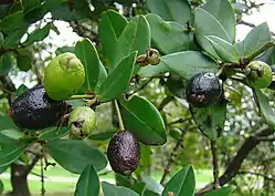 Alcanza 20 m de altura. El tronco mide entre 50 y 80 cm de diámetro; la corteza presenta parches lisos de color claro. Las flores de la planta son de color blanco. Los frutos tienen forma de globo, de 1 a 2 cm de diámetro, y al madurar se vuelven de color morado, vinotinto o marrón negruzco.[3][4]