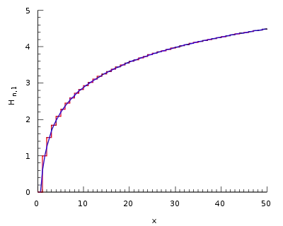 Hn crece igual de rápido que el logaritmo natural de n. La razón es que la suma está aproximada por la integral
