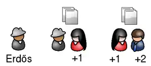 Erdős escribió cerca de 1500 artículos matemáticos, la mayoría de ellos en coautoría. Tuvo 509 colaboradores directos;[1] éstas son las personas con un número Erdős de 1. La gente que hubo colaborado con ellos (pero no con Erdős mismo) tiene un número Erdős de 2 (6,984 personas), aquellas personas que han colaborado con gente que tiene un número Erdős de 2 (pero no con Erdős mismo, ni con alguien con un número Erdős de 1) tienen un número Erdős de 3, y así sucesivamente.