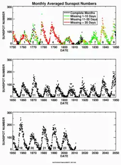 Este número ha sido usado por investigadores durante unos 300 años. Han encontrado que la actividad solar es cíclica y alcanza su máximo alrededor de cada 9.5 a 11 años (nota: correspondiente a los datos de SIDC durante los últimos 300 años y ejecutando la transformada de Fourier, se obtiene para el ciclo una duración de 10,4883 años. Este ciclo fue descubierto por Heinrich Schwabe en 1843.)