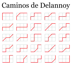 Así, por ejemplo D(3,2)=25 puesto que hay 25 caminos de Delannoy, ilustrados en la figura.