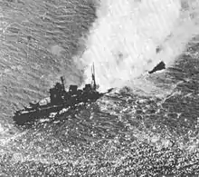 Cuando el Akebono se preparaba para darle remolque, un nuevo ataque se produjo a las 14 horas, procedente del USS Lexington recibiendo 5 torpedos sucesivamente, las explosiones escindieron al Nachi en tres partes flotantes independientes, la proa fue seccionada a la altura de la torre n.°1 y se hundió rápidamente, quedó solo la parte central y su popa cortada a nivel de la torre n.°3 separada a 50 m a flote en medio de una gran mancha de petróleo. La porción central a flote fue nuevamente atacada e impactada por 20 bombas y 16 cohetes y finalmente se hundió a las 14:50 hors con 807 hombres a bordo, solo sobrevivieron 74 marinos del Nachi. El Akebono, que tenía la misión de asistir al Nachi, fue también hundido con 54 bajas.[2] Shima envió a los destructores Ushio y Kasumi a rescatar a los supervivientes de ambos buques.