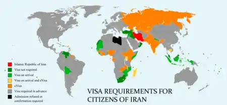 Los requisitos de visado para ciudadanos iraníes son las restricciones administrativas de entrada por parte de las autoridades de otros Estados a los ciudadanos de Irán. En 2021, los ciudadanos iraníes tenían acceso sin visado o visa a la llegada a 42 países y territorios, clasificando al pasaporte iraní en el 105.º lugar del mundo, según el Índice de restricciones de Visa.[5]