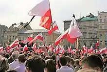 Un elemento importante del nacionalismo polaco ha sido su identificación con la religión católica, si bien su desarrollo político en Polonia es relativamente reciente, al tener sus raíces en la Contrarreforma del siglo XVII y no establecerse definitivamente hasta el período de entreguerras.[6][13][14][19] Aunque la antigua mancomunidad era religiosamente diversa y altamente tolerante,[20] la narración religiosa católica con los matices mesiánicos (el Cristo de las Naciones) se convirtió en una de las características definitorias de la identidad polaca moderna.[3][7][21] Roman Dmowski, un político polaco de esa época, fue vital en la definición de ese concepto, y ha sido llamado el "padre del nacionalismo polaco".[22][23][24]